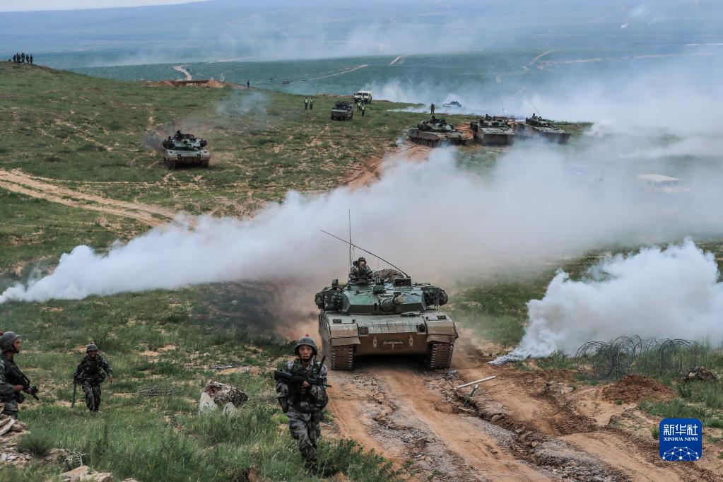 “跨越-2016·朱日和A”演习进入实兵对抗阵地进攻战,这是红蓝双方首场对抗中红军步兵和坦克协同(2016年7月19日摄)。新华社发(王佳寅 摄)