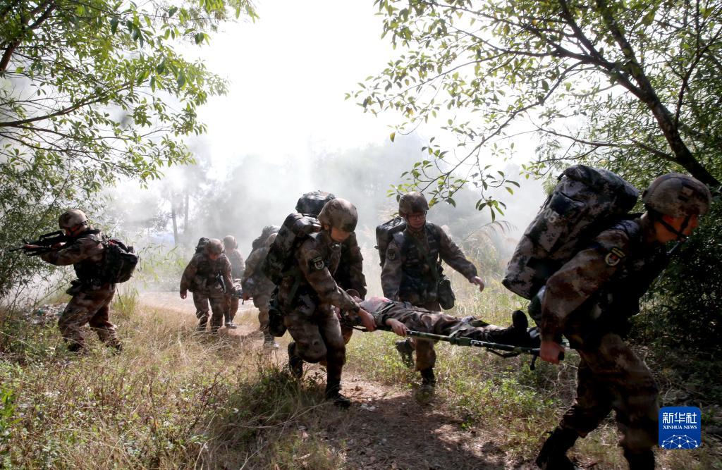 2022年1月4日,无锡联勤保障中心第910医院将野战医疗队拉到闽南某山区,在陌生地域开展实战化卫勤训练。新华社发(巴涛 摄)