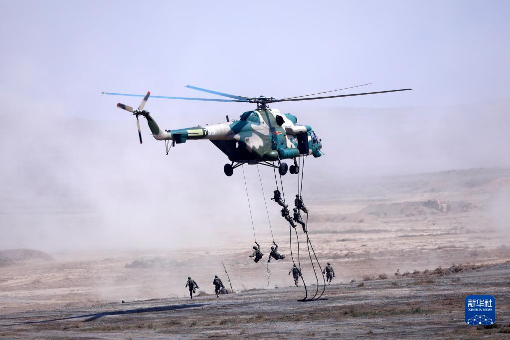 2021年8月13日,在宁夏某合同战术训练基地“西部·联合-2021”第二阶段联合实兵行动演练中,运输直升机搭载陆军特战小队至预定区域,特战队员实施索降。新华社记者 刘芳 摄