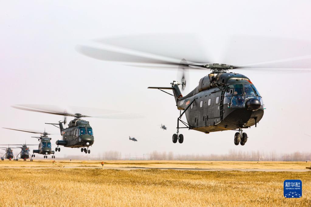 北部战区陆军第80集团军某陆航旅攻击直升机与运输直升机组成大机群编队进行跨昼夜飞行训练(2022年2月11日摄)。新华社发(刘雨辰 摄)
