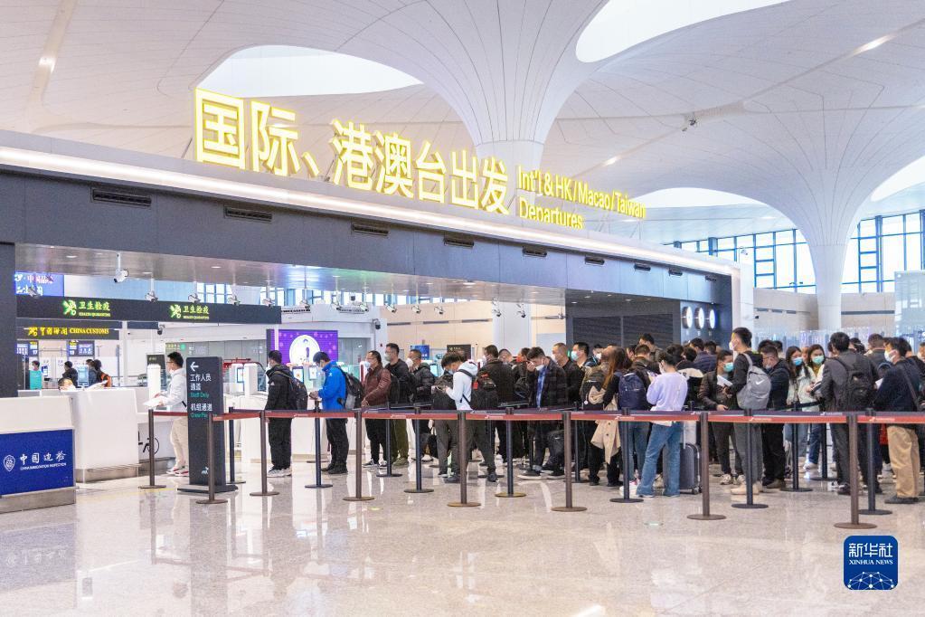 2月8日,准备前往印尼巴厘岛的旅客在杭州萧山国际机场T4航站楼排队等待。 新华社发(龙巍摄)