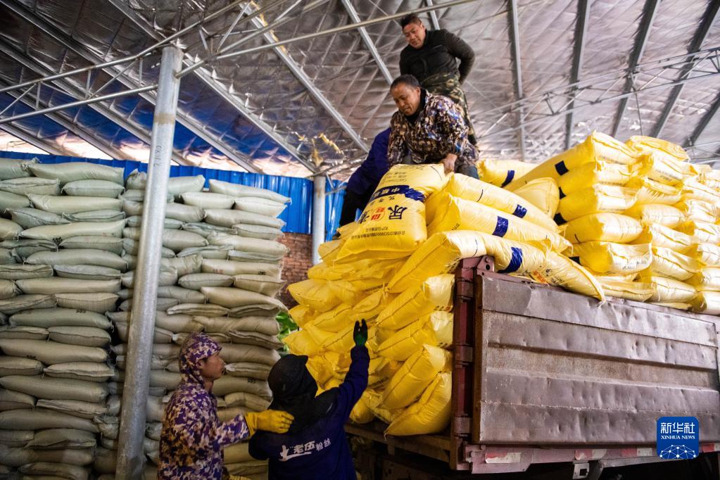 2月3日,工作人员在湖南省永州市祁阳市黎家坪镇供销惠农服务中心化肥储备库卸货。 新华社记者 陈思汗 摄