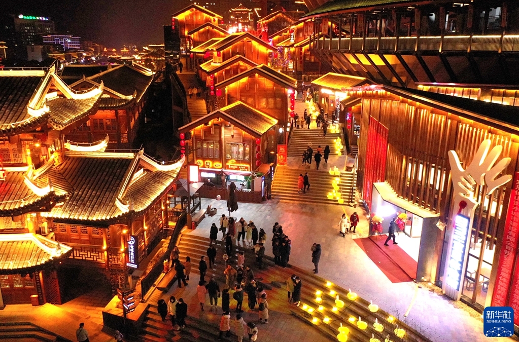 1月25日,湖北省宣恩县兴隆老街灯火辉煌(无人机照片)。新华社发(宋文 摄)