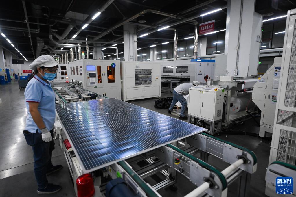 1月10日,在位于浙江嘉兴秀洲光伏小镇内的一家科技有限公司,工人在查看刚生产出来的光伏设备组件。新华社记者 徐昱 摄