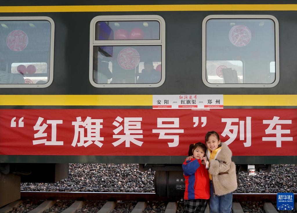 1月20日,在河南林州的铁路红旗渠站,两名小朋友在“红旗渠号”列车旁留影。新华社记者 李安 摄
