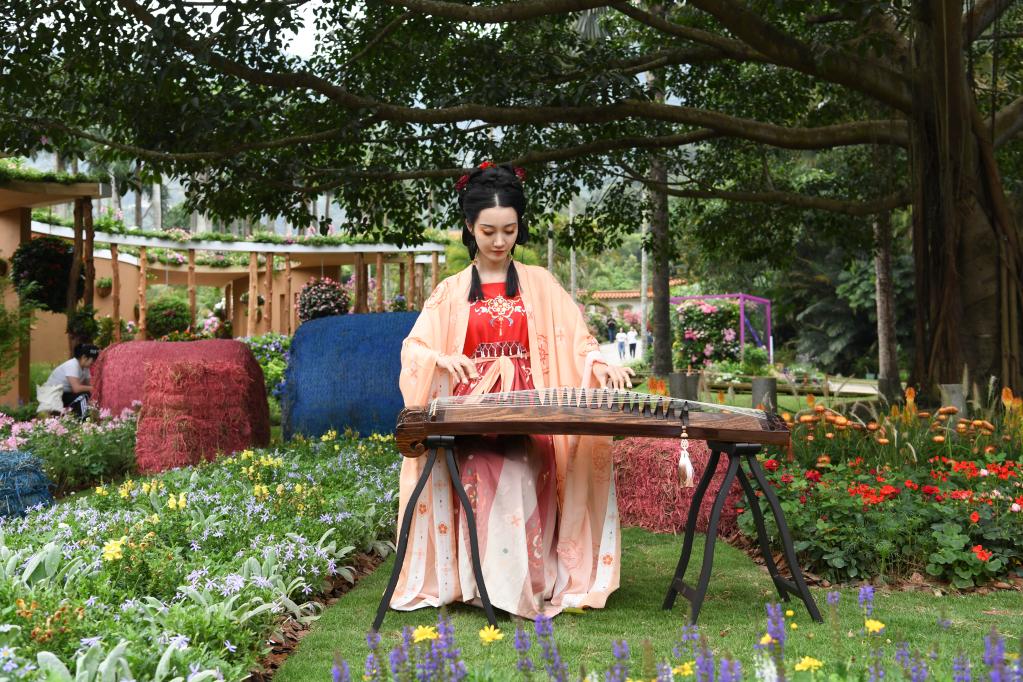 4月8日,一名女子在2023粤港澳大湾区花展现场进行民乐表演。新华社记者梁旭 摄