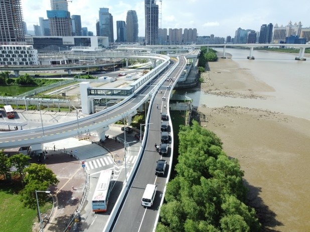 澳门大学连接横琴口岸通道桥位于莲花大桥南侧,联通莲花大桥与澳门大学横琴校区,道路全长约808米。该项目是澳门特区政府“二五”规划重点项目之一,也是横琴粤澳深度合作区建设总体方案规划重点项目之一。项目施工过程中,建设团队克服开工前桥梁设计方案调整、施工工期紧张、作业条件极度受限等难题,精心安排施工,加快建设进度,做到“保质保量”与“工期控制”两不误,如期完成了钢箱梁顶推、桥体合拢等关键节点,确保工程按期完工。