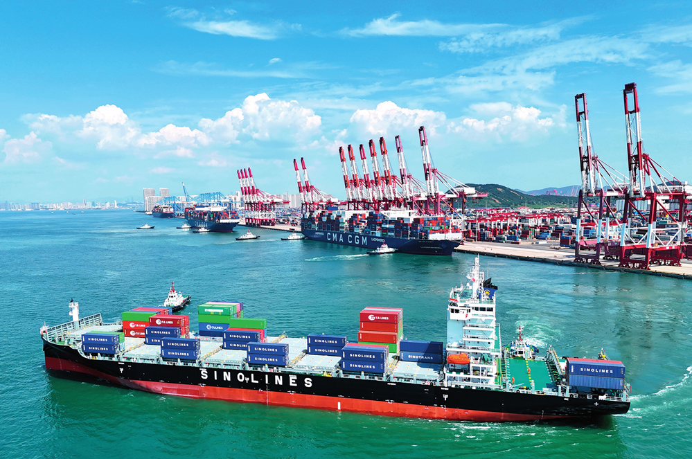 “中外运海口”轮从山东港口青岛港出发,驶向印度钦奈港(2023年8月30日摄)。今年以来,山东港口青岛港新增 10 条“一带一路”航线。 张进刚摄/《瞭望》
