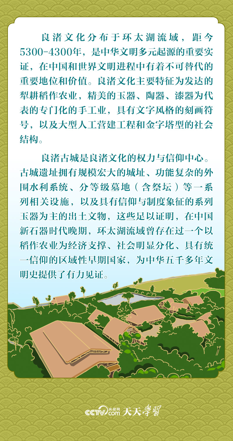 2023年12月3日,习近平主席向首届“良渚论坛”致贺信时指出,良渚遗址是中华五千年文明史的实证,是世界文明的瑰宝。
