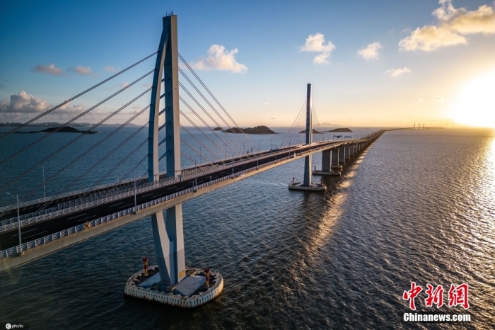 资料图:港珠澳大桥跨越伶仃洋,全长55公里,东接香港,西接广东省珠海市和澳门,是在“一国两制”框架下、粤港澳三地首次合作建设的超大型跨海交通工程。图/ICphoto