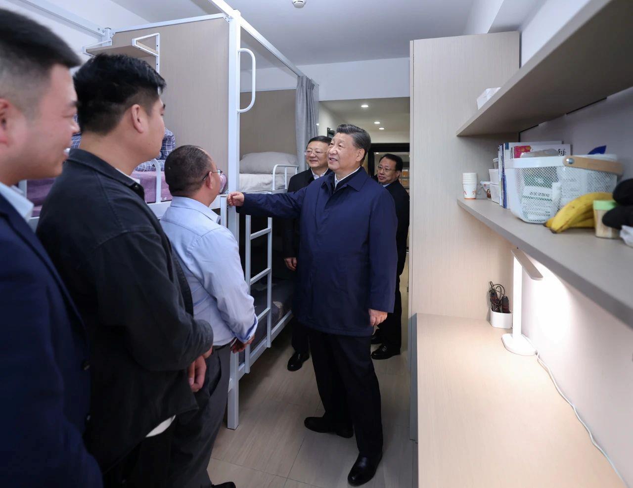 习近平总书记走进出租房社区,有一栋楼是宿舍型出租房源。其中一个四人间,租户都是附近物业公司的保安。他们说:“这里有公共的厨房、洗衣房、浴室,还有会客室,外面有羽毛球场、篮球场,蛮好、蛮好!”