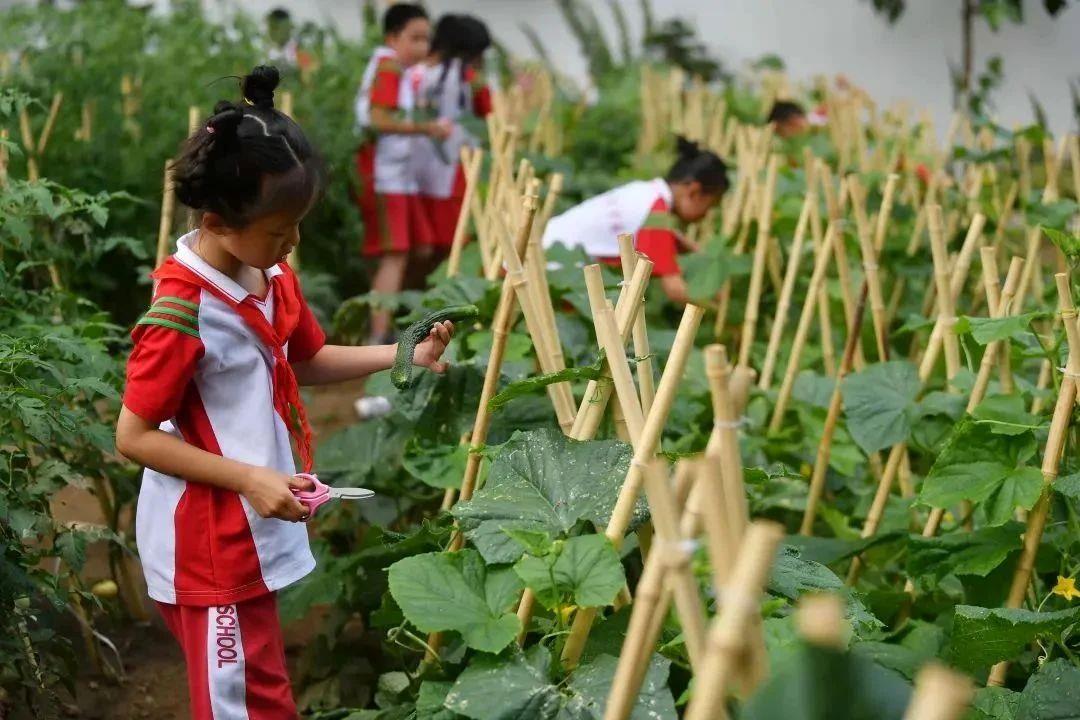 今年6月,育英学校小农场迎来丰收,同学们在采摘蔬菜。
