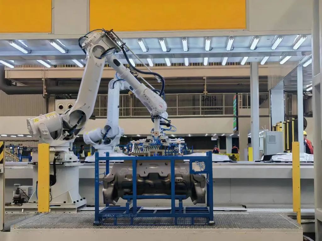 陕西某品牌汽车工厂冲压车间机器人正在自动抓件。