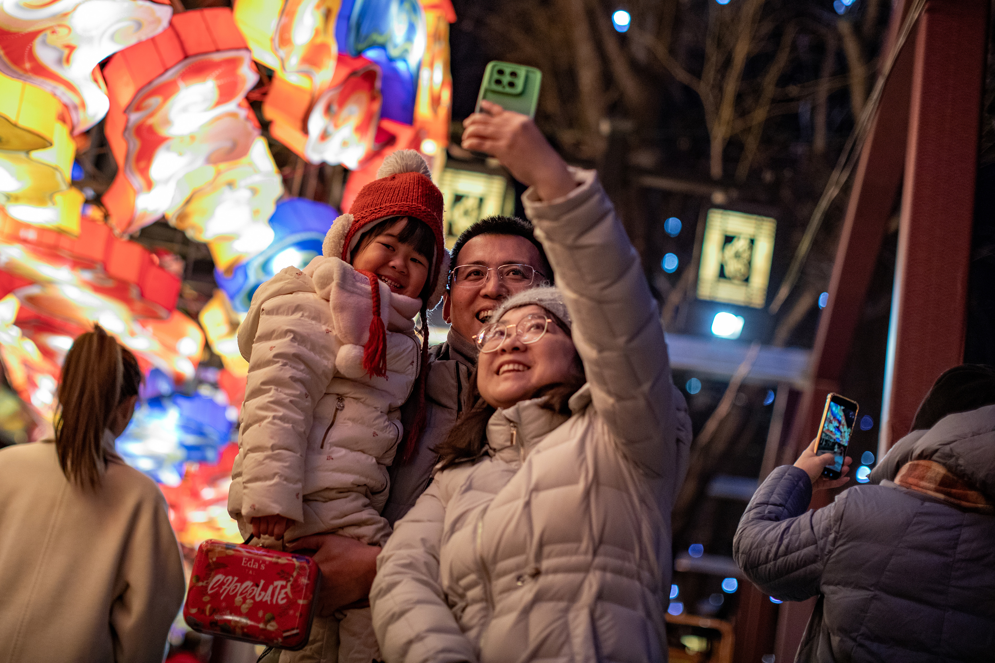 2024年2月8日晚,北京,什刹海畔荷花市场上空,200余米的“蛟龙出海”巨型龙灯点亮,吸引市民打卡拍照。