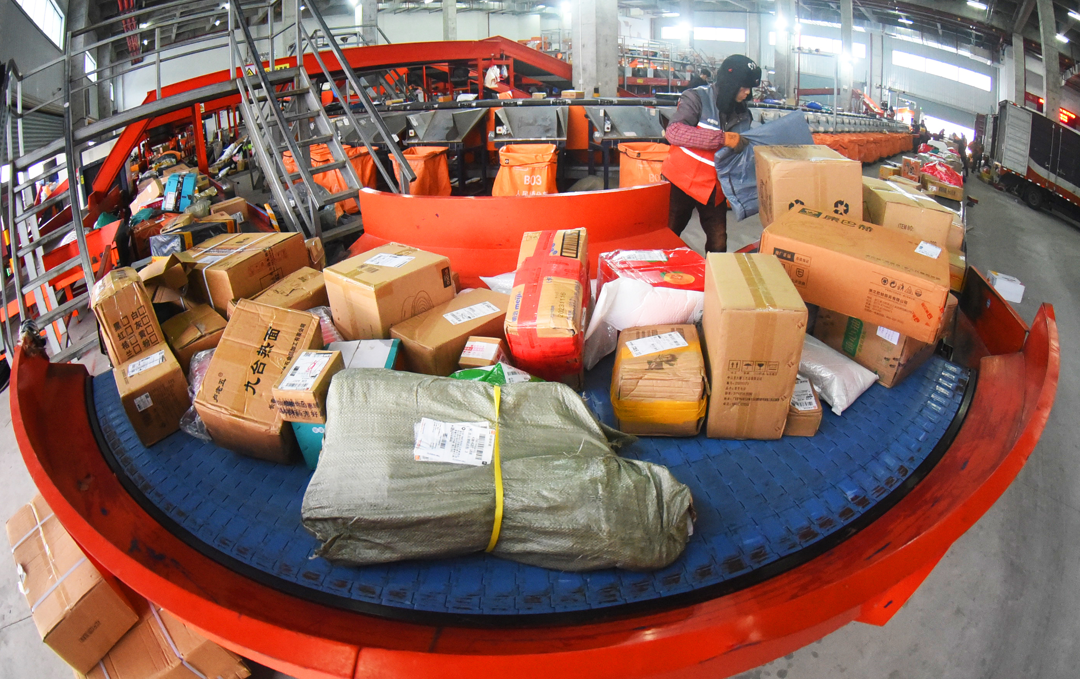2024年2月5日,江苏省连云港市公用配送中心一家快递公司工作人员正在加紧分拣、发送快递包裹。