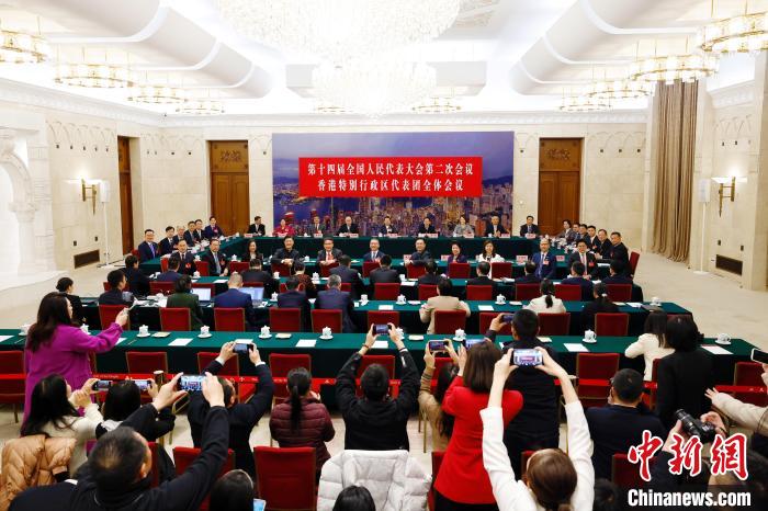 3月6日,出席十四届全国人大二次会议的香港特别行政区代表团举行开放团组会议。图为会议前,与会代表面向媒体亮相。中新社记者 韩海丹 摄