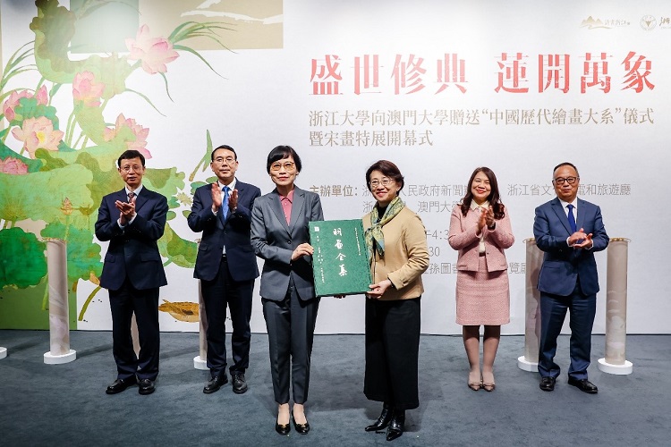 浙江大学向澳门大学赠送“中国历代绘画大系”(以下简称“大系”)仪式3月13日下午在澳门大学伍宜孙图书馆展览厅举办。“盛世修典 莲开万象——‘中国历代绘画大系’宋画特展”同场开幕,展出80件绘画作品高精度调色打样稿。浙江省委常委、宣传部部长赵承,澳门大学校长宋永华,浙江大学党委副书记朱慧等出席仪式。