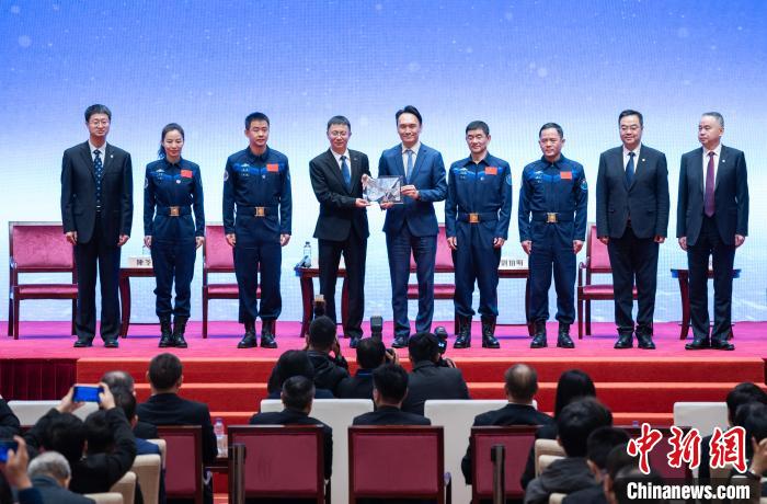 2023年12月2日,在澳门访问的中国载人航天工程代表团在当地举行“中国载人航天专场报告会”。图为代表团团长、中国载人航天工程办公室副主任林西强(左四)向澳门特区政府教育及青年发展局局长龚志明(左五)赠送中国空间站高清图片纪念品。(资料图片)中新网记者 侯宇 摄