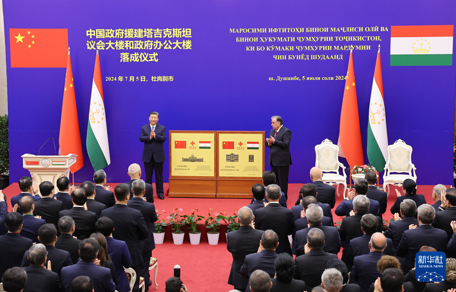 当地时间7月5日下午,国家主席习近平同塔吉克斯坦总统拉赫蒙在杜尚别共同出席中方援塔议会大楼和政府大楼落成仪式。
