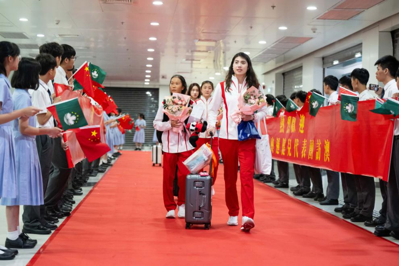 8月31日,游泳运动员张雨霏(前)在欢迎仪式上。当日,巴黎奥运会内地奥运健儿代表团抵达澳门,开始为期三天的访问。新华社记者 张金加 摄