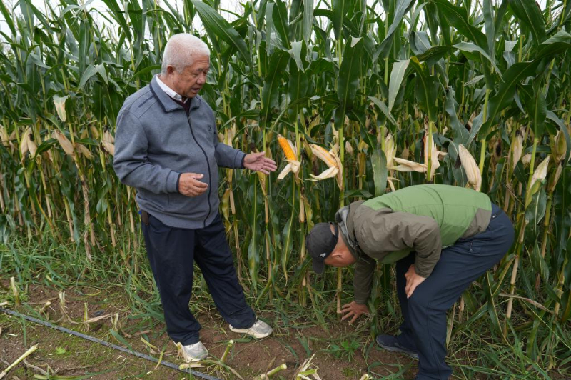 杨生明(左)和农户探讨玉米种植技术。新华社记者 唐紫宸 摄