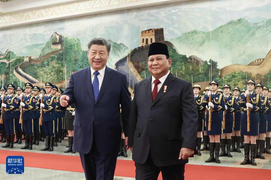 11月9日下午,国家主席习近平在北京人民大会堂同来华进行国事访问的印度尼西亚总统普拉博沃举行会谈。这是会谈前,习近平在人民大会堂北大厅为普拉博沃举行欢迎仪式。新华社记者 谢环驰 摄