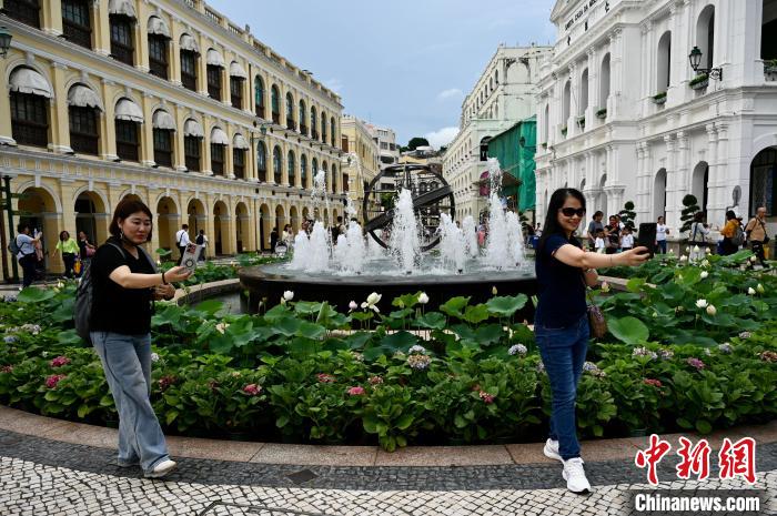 图为2024年6月,澳门议事厅前地喷水池荷花盛开,吸引市民及游客观赏拍照留念。(资料图) 中新社记者 李志华 摄