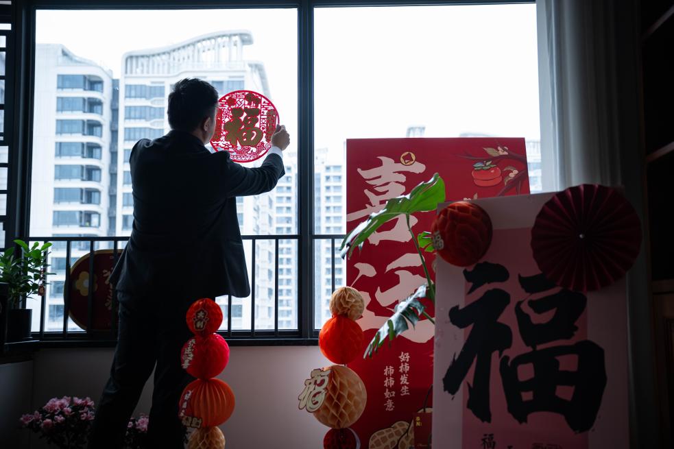 12月11日,黄滋才在“澳门新街坊”的家里贴福字。