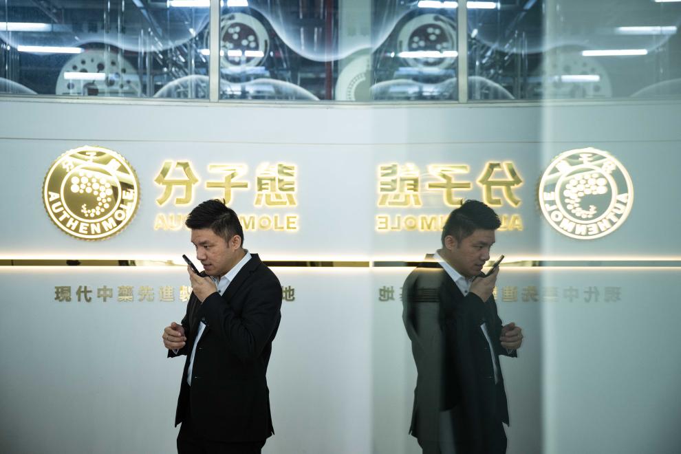 12月11日,黄滋才在位于横琴的分子态(珠海横琴)中医药健康产业发展有限公司用手机处理事务。