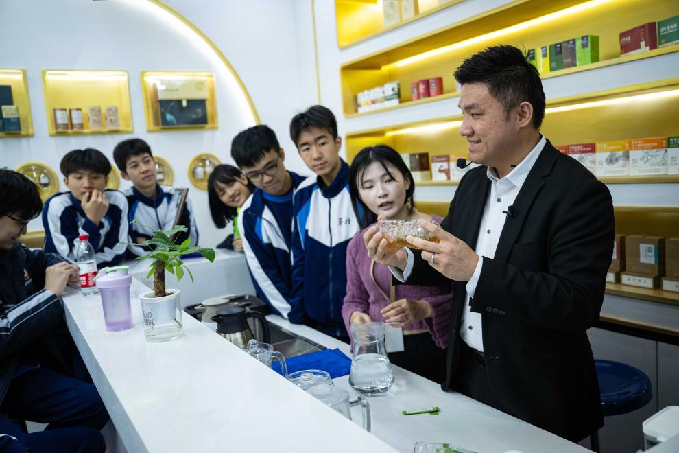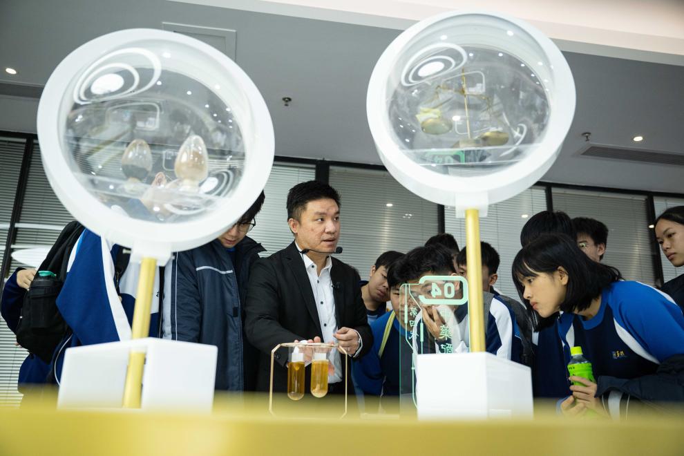 12月11日,黄滋才(右一)在位于横琴的分子态(珠海横琴)中医药健康产业发展有限公司的植物(现代中药)分子博物馆内与澳门劳校中学的学生交流。
