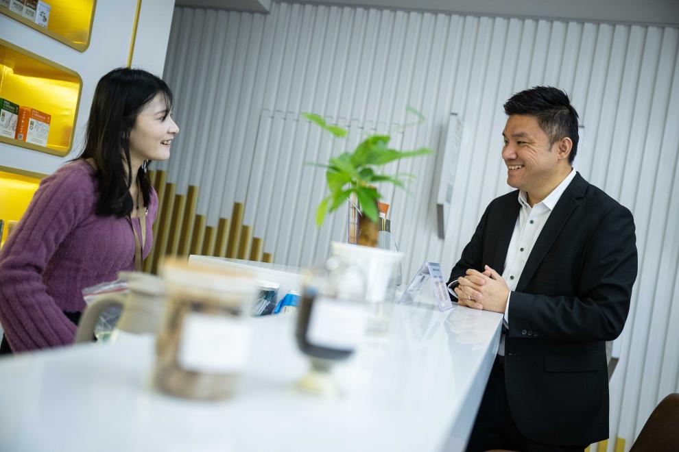 12月11日,黄滋才(右)在位于横琴的分子态(珠海横琴)中医药健康产业发展有限公司与同事聊天。