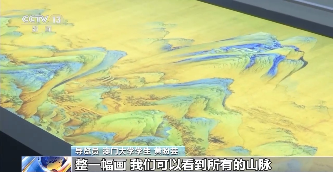 导览员 澳门大学学生 黄盼芸:整一幅画,我们可以看到所有的山脉都是平铺摊开来的,让我们感受到了这种邈远悠远的氛围。我们也可以看到,即使在高峻和绵延的山脉之中,也有小渔船以及在耕作的人们,即使是这么微小的人物,都有非常精细的笔墨。
