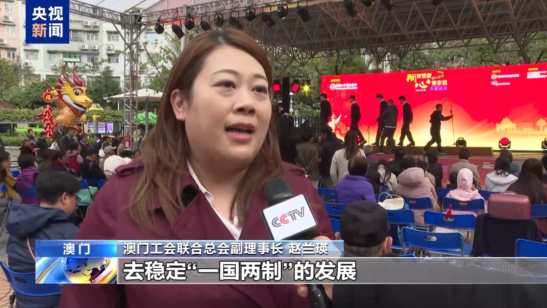 澳门工会联合总会副理事长 赵兰瑛:未来,我们会更好地去稳定“一国两制”的发展,行稳致远。我们也会发展好我们作为澳门社团的一个传统爱国爱澳的精神,引领着我们的群众,带领着我们的居民,更好地去投入国家的怀抱,融入国家发展的大局。