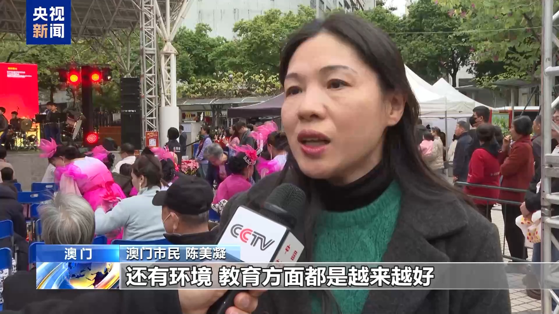 澳门市民 陈美凝:回归之后,我们大家每一个市民都很兴奋。澳门不单是经济,还有环境、教育方面都是越来越好,我们每一天都是觉得很幸福。希望我们可以见证着一个美好的生活,见到我们越来越好的澳门。
