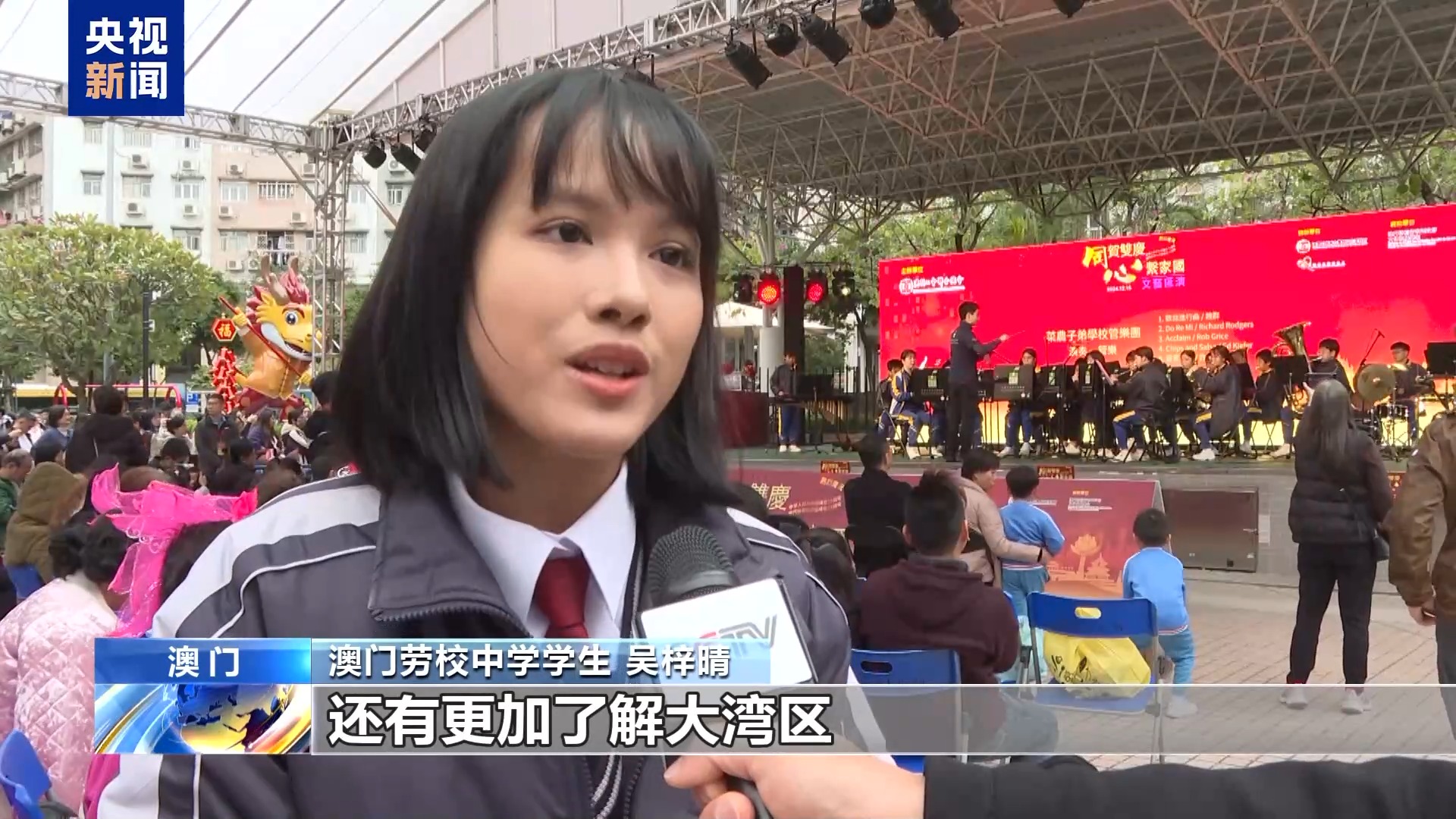 澳门劳校中学学生 吴梓晴:澳门青年也可以在澳门,去拓展自己对于粤港澳大湾区的知识面,更加了解大湾区。在未来,澳门青年在大湾区里投入工作或者是在大湾区里面作出一些贡献,这些都是能够为我们国家作出贡献。