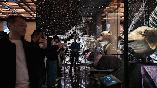 博物馆中央位置,4件兽首铜像分立于玻璃展柜中,三面数字大屏环绕着猪首、猴首、牛首和虎首铜像。“牛的兽首最能体现中西文化之间的结合。看一下牛角,在中国比较常见的牛,譬如水牛或者黄牛,牛角都是向后的。但在这个兽首上看到的牛角是向前的,所以我们认为这是一只西方的牛。”工作人员介绍道。