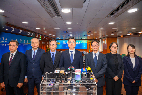 图为立法会选举管理委员会主席盛锐敏及廉政公署助理专员黄剑锋向传媒介绍会议内容。(澳门特区新闻局供图)