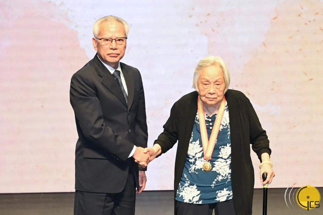 上图为岑浩辉向蔡俊烈士家属梁凤文女士颁发纪念章。图片来源:澳门特区政府新闻局