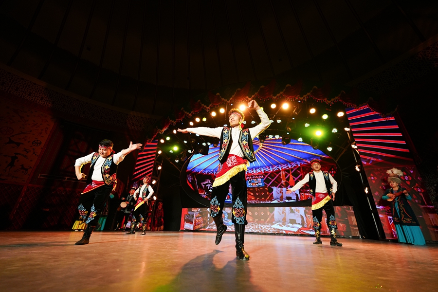 演员在位于新疆阿图什市的玛纳斯史诗大剧院为游客演绎《玛纳斯》(2025年4月22日摄)。新华社记者 徐宏岩 摄