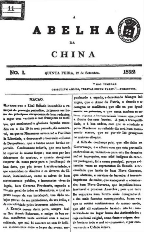 《蜜蜂华报》是中国出版的第一份外文报纸。该报纸的主要语言为葡萄牙语,于1822年9月12日创办,1823年12月26日停刊,一共出版67期。