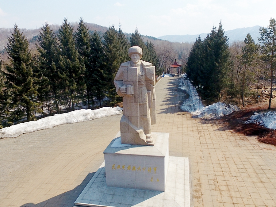 矗立在吉林省靖宇县杨靖宇将军殉国地的杨靖宇雕像(2017年3月22日摄)。新华社记者 曾涛 摄