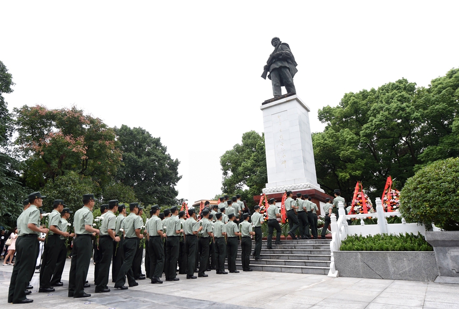 在位于重庆市铜梁区的邱少云烈士纪念馆,武警官兵向邱少云烈士纪念碑献花(2017年9月30日摄)。新华社记者 唐奕 摄