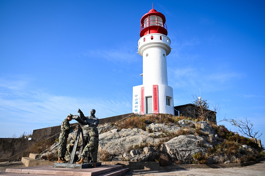 开山岛守岛民兵保养清洁王继才雕像(2024年10月25日摄)。新华社记者 邓华 摄