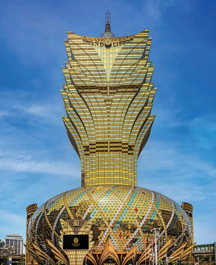 新葡京酒店位于澳门半岛葡京路,正门面向嘉乐庇总督大桥,是澳门第二高建筑物(楼高258米,仅次于澳门旅游塔),外形设计犹如一朵巨大的金莲花。新葡京酒店底部的“万象球”,以金蛋为造型,寓意吉祥好运;万象球的表面由120万粒液晶发光原体(LED)组成,晚上可显示千变万化的图案和文字,散发缤纷迷人的色彩。