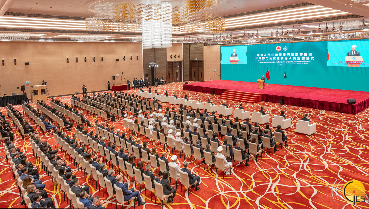 根据《澳门基本法》《维护国家安全法》,以及经修订于11月1日生效的《领导及主管人员通则的基本规定》及《澳门公共行政工作人员通则》,澳门特区政府举行宣誓仪式。上午10时,在奏唱中华人民共和国国歌后,行政长官岑浩辉、立法会主席张永春、终审法院院长宋敏莉、行政法务司司长黄少泽、经济财政司司长戴建业、保安司司长陈子劲、社会文化司司长柯岚、运输工务司司长谭伟文、检察长唐晓峰、廉政专员欧阳湘和审计长欧阳瑜监誓,公共行政部门、立法会辅助部门、终审法院院长办公室、检察长办公室、廉政专员办公室和审计长办公室领导及等同人员庄严宣誓。