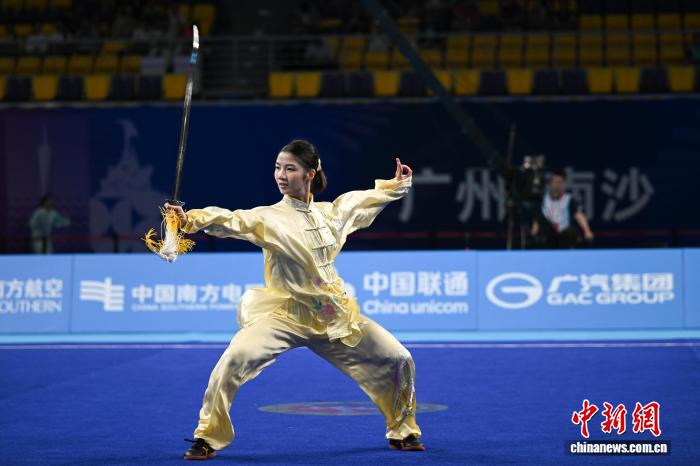 11月7日,第十五届全国运动会武术套路女子太极拳太极剑全能比赛在广州南沙体育馆举行。图为澳门选手郭慧铭在太极剑的比赛中。中新社记者 陈楚红 摄