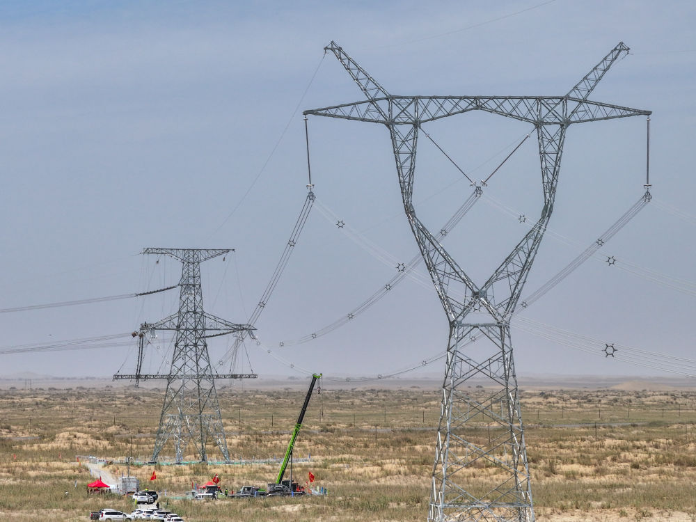 2025年7月13日,在塔里木盆地南缘的新疆和田地区民丰县,随着牵引机将最后一段电线成功从183号铁塔拽至188号铁塔,历时15年建设的环塔里木盆地750千伏输变电工程全线贯通(无人机照片)。新华社记者 丁磊 摄