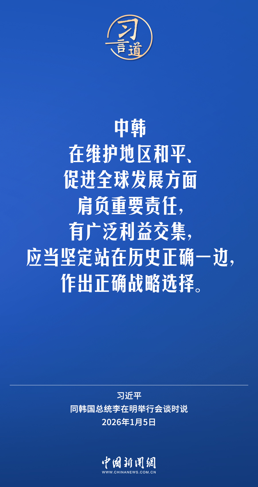 1月5日,国家主席习近平在北京人民大会堂同来华进行国事访问的韩国总统李在明举行会谈。习近平指出——