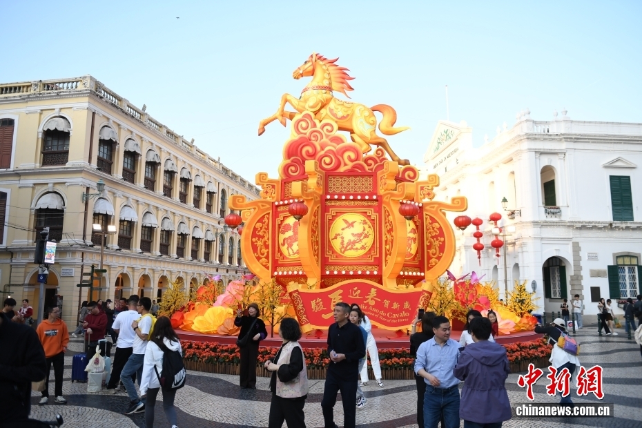 2月13日,随着农历马年新春临近,澳门多地加装骏马主题装饰,市面氛围热闹喜庆,以骏马奔腾之姿迎接新春。图为澳门议事亭前地的马年新春装饰。中新社记者 郑嘉伟 摄