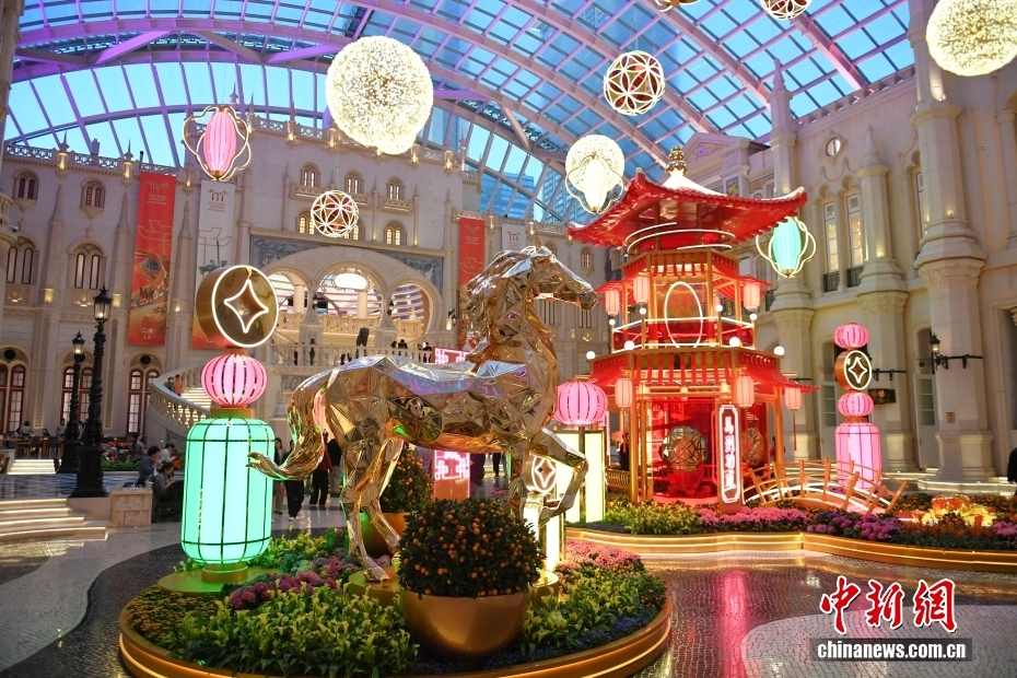2月13日,随着农历马年新春临近,澳门多地加装骏马主题装饰,市面氛围热闹喜庆,以骏马奔腾之姿迎接新春。图为澳门美高梅天幕广场的马年新春装饰。中新社记者 郑嘉伟 摄pagebreak
